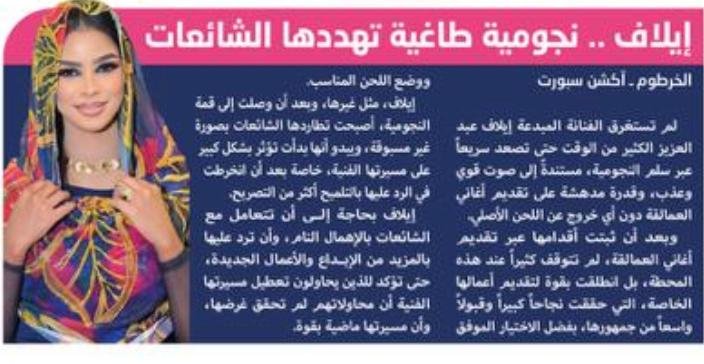 إيلاف بحاجة إلى أن تتعامل مع الشائعات بالإهمال التام، وأن ترد عليها بالمزيد من الإبداع والأعمال الجديدة، حتى تؤكد للذين يحاولون تعطيل مسيرتها الفنية أن محاولاتهم لم تحقق غرضها، وأن مسيرتها ماضية بقوة.