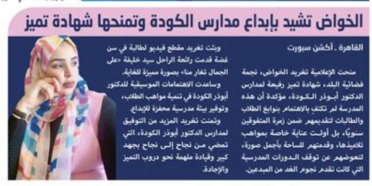منحت الإعلامية تغريد الخواص، نجمة فضائية البلد، شهادة تميز رفيعة لمدارس الدكتور أبوذر الكودة، مؤكدة أن هذه المدرسة لم تكتفِ بالاهتمام بنوابغ الطلاب والطالبات لتقديمهم ضمن زمرة المتفوقين سنويًا، بل أولت عناية خاصة بمواهب تلاميذها، وقدمتهم للساحة بأجمل صورة، لتعوضهم عن توقف الدورات المدرسية التي كانت تقدم نجوم الغد من المبدعين.