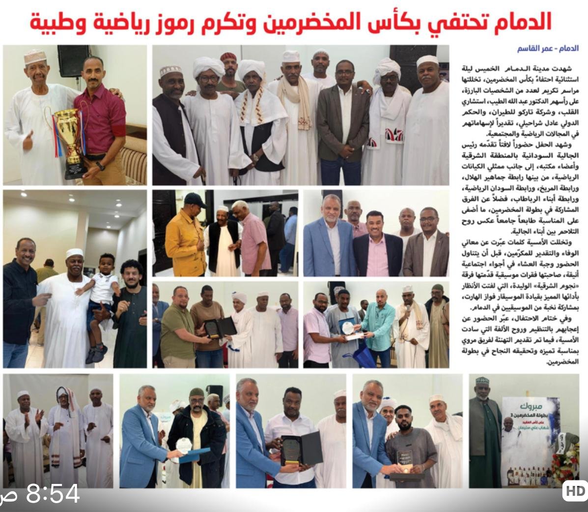 وشهد الحفل حضوراً لافتاً تقدّمه رئيس الجالية السودانية بالمنطقة الشرقية وأعضاء مكتبه، إلى جانب ممثلي الكيانات الرياضية، من بينها رابطة جماهير الهلال، ورابطة المريخ، ورابطة السودان الرياضية، ورابطة أبناء الرباطاب، فضلاً عن الفرق المشاركة في بطولة المخضرمين، ما أضفى على المناسبة طابعاً جامعاً عكس روح التلاحم بين أبناء الجالية.