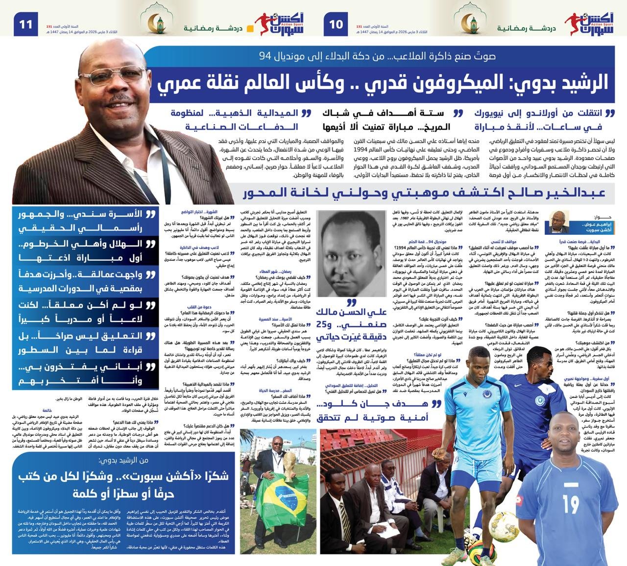 أتقدم بخالص الشكر والتقدير للزميل الحبيب إلى نفسي إبراهيم عوض رئيس تحرير صحيفة آكشن سبورت، على هذه الاستضافة الكريمة التي أعتز بها كثيراً. كما أزجي التحية لكل من سطّر كلمات طيبة في الحوار المصاحب لهذا اللقاء، ولكل من كتب في حقي كلمات إشادة وثناء، أعتبرها وساماً أضعه على صدري ومسؤولية تدفعني لمواصلة العطاء.
