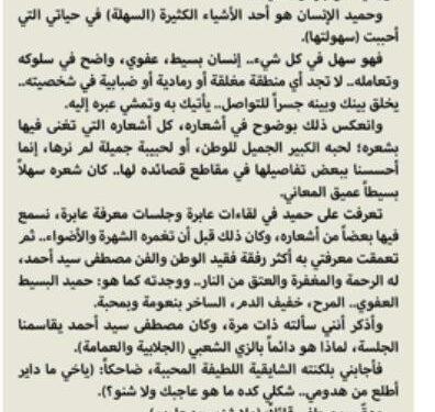 رحم الله حميد الإنسان الشاعر، الذي لم تغيره شهرة ولم تبهره أضواء.. وظل كما هو بسيطاً عفوياً، مرحاً خفيف الدم، ساخراً بمحبة.. يكتب للوطن بأغلى وأجمل معاني الانتماء والحب، ويكتب للحبيبة بأجمل وأغلى معاني آماله وأحلامه معها.