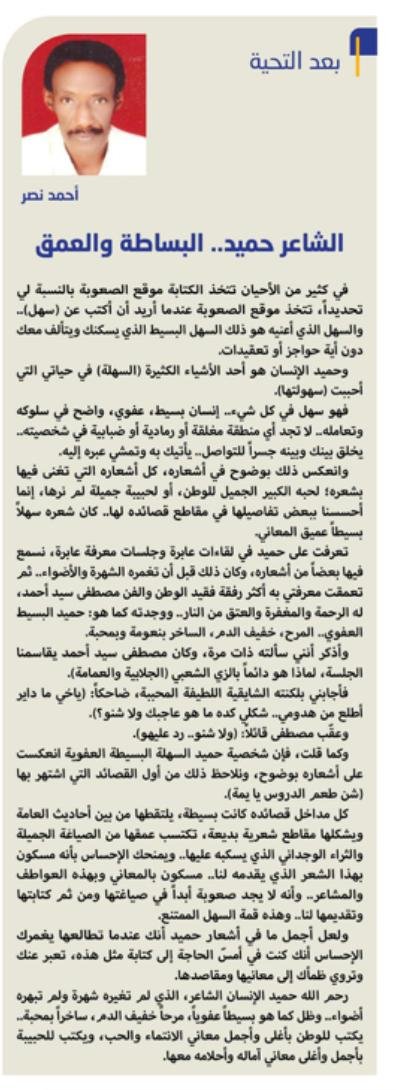 • تعرفت على حميد في لقاءات عابرة وجلسات معرفة عابرة، نسمع فيها بعضاً من أشعاره، وكان ذلك قبل أن تغمره الشهرة والأضواء.. ثم تعمقت معرفتي به أكثر رفقة فقيد الوطن والفن مصطفى سيد أحمد، له الرحمة والمغفرة والعتق من النار.. ووجدته كما هو: حميد البسيط العفوي.. المرح، خفيف الدم، الساخر بنعومة وبمحبة.
