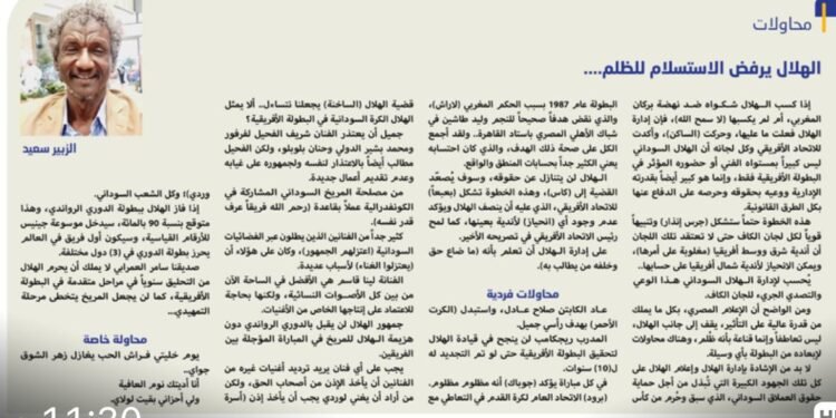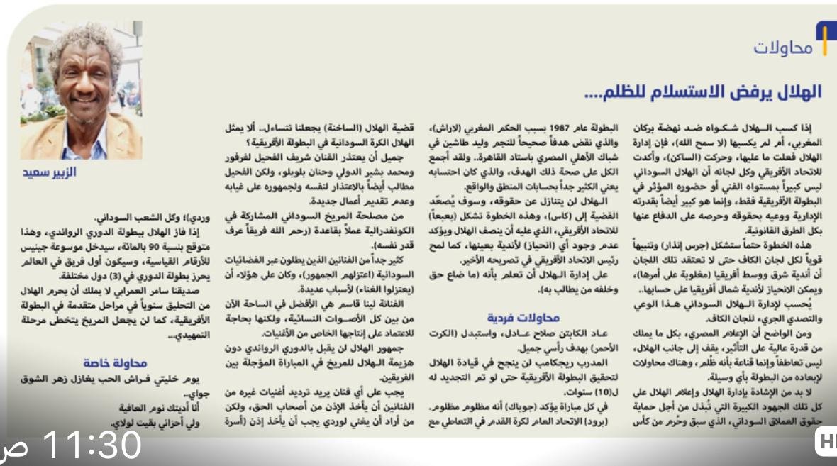 لا بد من الإشادة بإدارة الهلال وإعلام الهلال على كل تلك الجهود الكبيرة التي تُبذل من أجل حماية حقوق العملاق السوداني، الذي سبق وحُرم من كأس البطولة عام 1987 بسبب الحكم المغربي (لاراش)، والذي نقض هدفاً صحيحاً للنجم وليد طاشين في شباك الأهلي المصري باستاد القاهرة.. ولقد أجمع الكل على صحة ذلك الهدف، والذي كان احتسابه يعني الكثير جداً بحسابات المنطق والواقع.