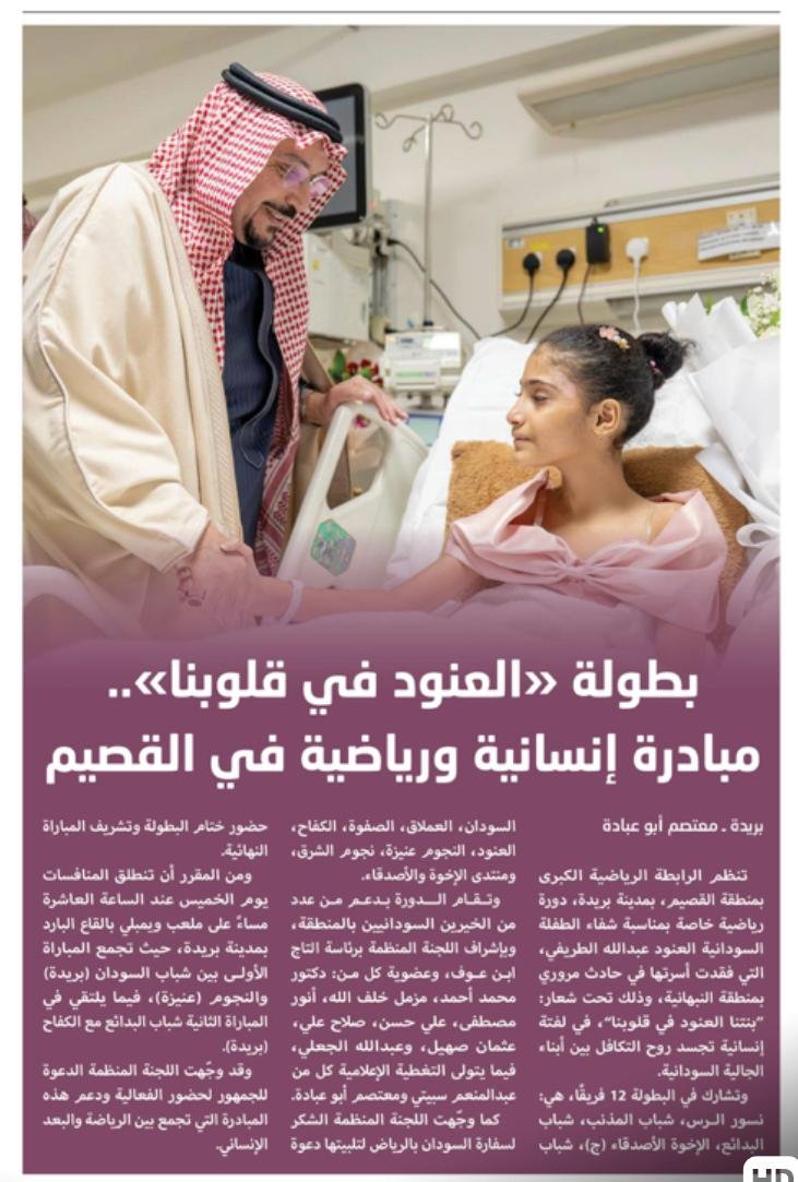 تنظم الرابطة الرياضية الكبرى بمنطقة القصيم، بمدينة بريدة، دورة رياضية خاصة بمناسبة شفاء الطفلة السودانية العنود عبدالله الطريفي، التي فقدت أسرتها في حادث مروري بمنطقة النبهانية، وذلك تحت شعار: “بنتنا العنود في قلوبنا”، في لفتة إنسانية تجسد روح التكافل بين أبناء الجالية السودانية.
