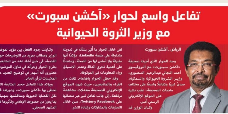 وجد الحوار الذي أجرته صحيفة «آكشن سبورت» مع البروفيسور أحمد التجاني عبدالرحيم المنصوري، وزير الثروة الحيوانية والسمكية، صدىً كبيرًا وتفاعلًا واسعًا على مختلف منصات الصحيفة، عقب نشره على الموقع الإلكتروني الرسمي أمس.