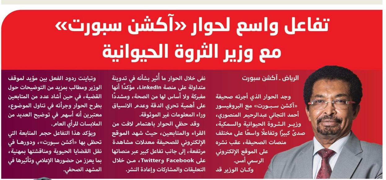 وجد الحوار الذي أجرته صحيفة «آكشن سبورت» مع البروفيسور أحمد التجاني عبدالرحيم المنصوري، وزير الثروة الحيوانية والسمكية، صدىً كبيرًا وتفاعلًا واسعًا على مختلف منصات الصحيفة، عقب نشره على الموقع الإلكتروني الرسمي أمس.