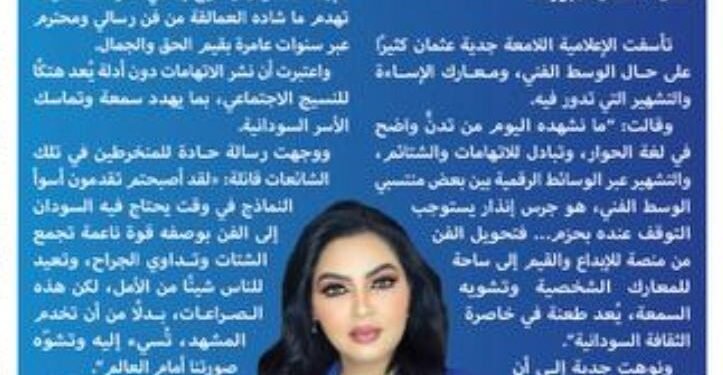 وقالت: “ما نشهده اليوم من تدنٍّ واضح في لغة الحوار، وتبادل للاتهامات والشتائم، والتشهير عبر الوسائط الرقمية بين بعض منتسبي الوسط الفني، هو جرس إنذار يستوجب التوقف عنده بحزم… فتحويل الفن من منصة للإبداع والقيم إلى ساحة للمعارك الشخصية وتشويه السمعة، يُعد طعنة في خاصرة الثقافة السودانية”.