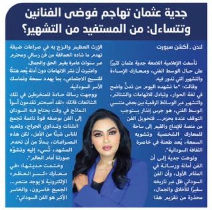 جدية عثمان تهاجم فوضى الفنانين وتتساءل: من المستفيد من التشهير؟