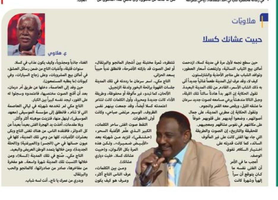 التاج مكي.. صُنع في تلك المدينة (كسلا)، ومن خلالها اكتسبت تلك المدينة شهرة واسعة.. هو مفخرة من مفاخرها، صادر من صادراتها، كالمانجو والحب والبرتقال.