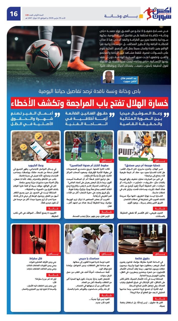 في مساحةٍ خفيفةٍ لا تخلو من العمق، تولد صفحة «باص وخانة» كنافذة مختلفة على تفاصيل الحياة اليومية، بنكهة سودانية خالصة تمزج بين الطرافة والنقد الذكي. هنا لا مكان للخطابة الجافة ولا للطرح المتكلف، بل «ونسة» واعية تقرأ الواقع بعين ناقدة ولسان بسيط يصل إلى الجميع. الفكرة تقوم على كبسولات قصيرة، تلتقط مشاهد من الرياضة والمجتمع والفن، وتضعها تحت مجهر السخرية الهادفة، دون أن تفقد روحها الإنسانية. «باص وخانة» ليست مجرد صفحة، بل محاولة لقول الحقيقة بأسلوب خفيف… يضحكك أحيانًا، ويوقظك كثيرًا.