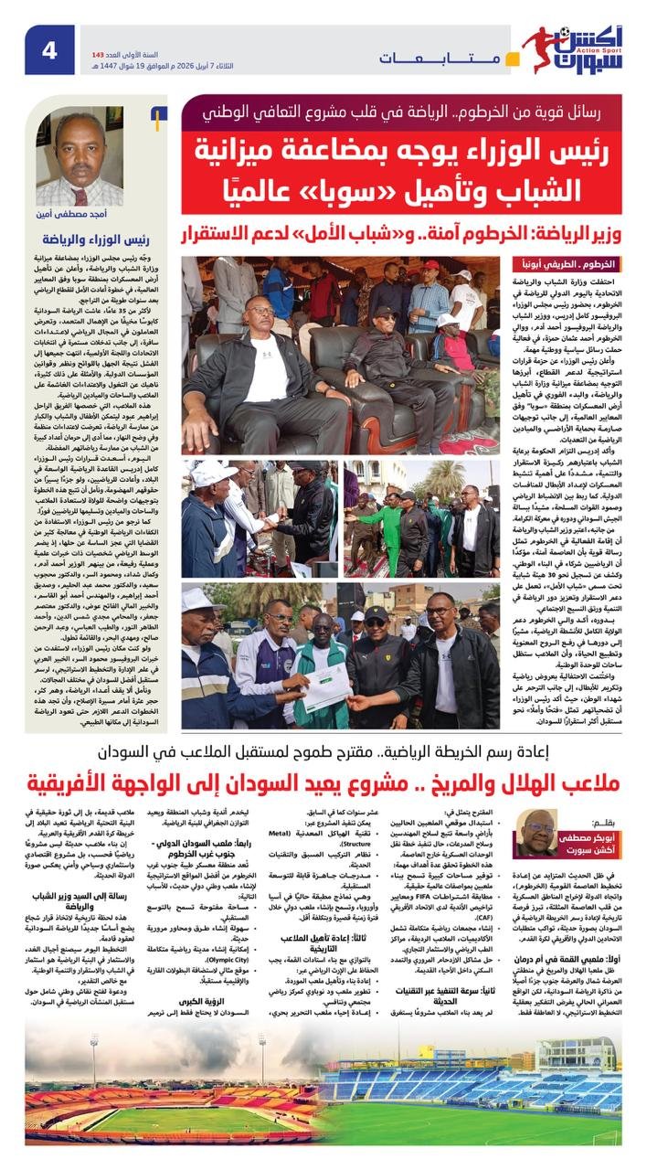 • احتفلت وزارة الشباب والرياضة الاتحادية باليوم الدولي للرياضة في الخرطوم، بحضور رئيس مجلس الوزراء البروفيسور كامل إدريس، ووزير الشباب والرياضة البروفيسور أحمد آدم، ووالي الخرطوم أحمد عثمان حمزة، في فعالية حملت رسائل سياسية ووطنية مهمة.