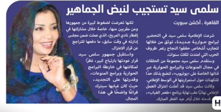 شرعت الإعلامية سلمى سيد في التحضير لبرامج حوارية جديدة، توثق من خلالها لتجارب أشخاص حققوا النجاح رغم ظروف الحرب التي امتدت لثلاث سنوات.