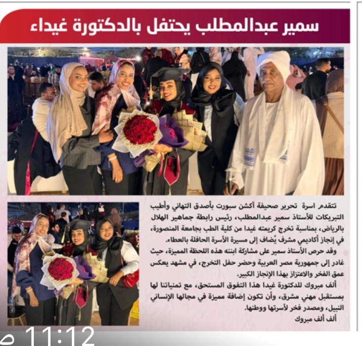 تتقدم اسرة تحرير صحيفة آكشن سبورت بأصدق التهاني وأطيب التبريكات للأستاذ سمير عبدالمطلب، رئيس رابطة جماهير الهلال بالرياض، بمناسبة تخرج كريمته غيدا من كلية الطب بجامعة المنصورة، في إنجاز أكاديمي مشرف يُضاف إلى مسيرة الأسرة الحافلة بالعطاء.