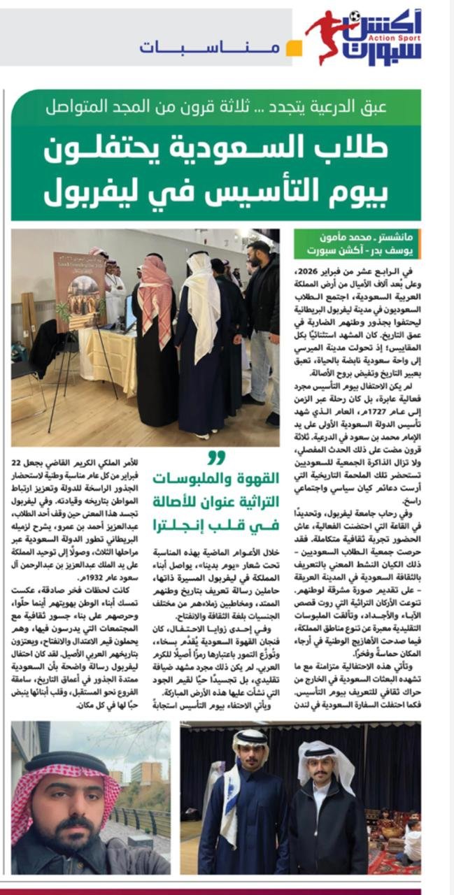 في الرابع عشر من فبراير 2026، وعلى بُعد آلاف الأميال من أرض المملكة العربية السعودية، اجتمع الطلاب السعوديون في مدينة ليفربول البريطانية ليحتفوا بجذور وطنهم الضاربة في عمق التاريخ. كان المشهد استثنائيًا بكل المقاييس؛ إذ تحولت مدينة الميرسي إلى واحة سعودية نابضة بالحياة، تعبق بعبير التاريخ وتفيض بروح الأصالة.