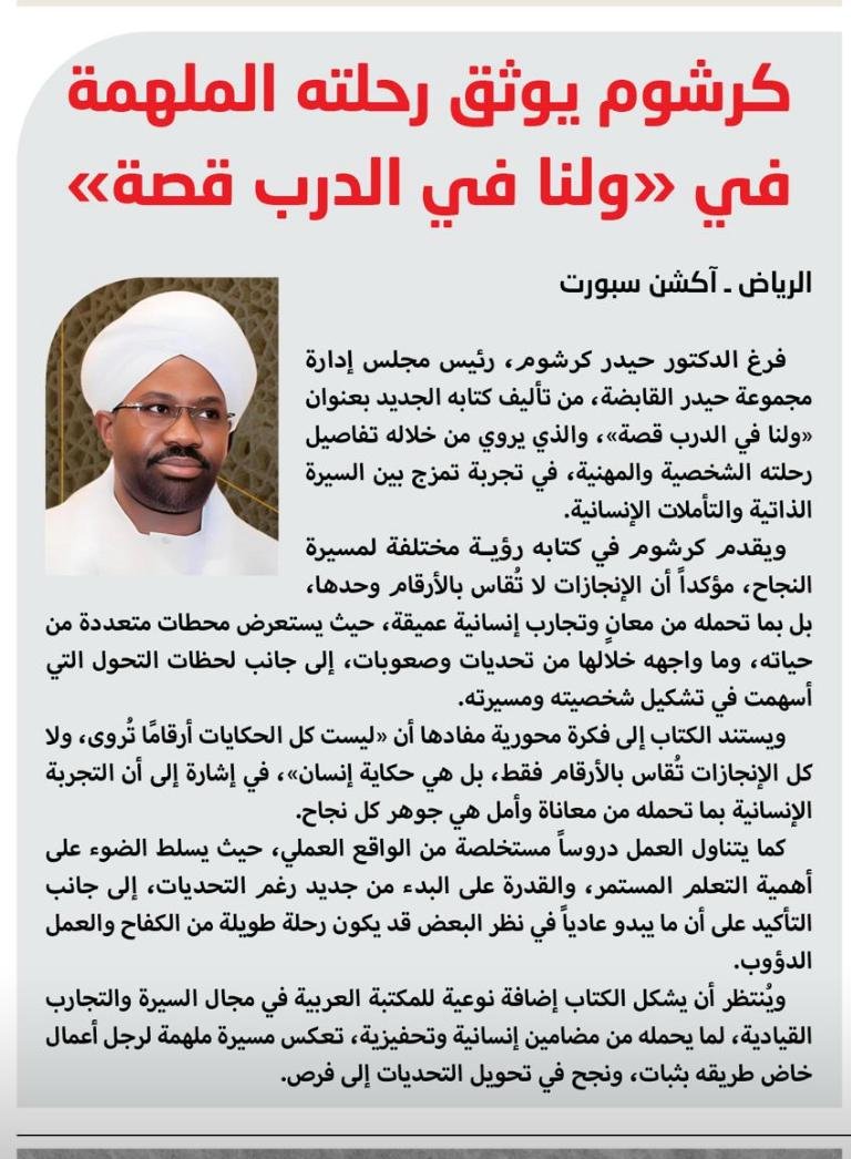 فرغ الدكتور حيدر كرشوم، رئيس مجلس إدارة  مجموعة حيدر القابضة، من تأليف كتابه الجديد بعنوان «ولنا في الدرب قصة»، والذي يروي من خلاله تفاصيل رحلته الشخصية والمهنية، في تجربة تمزج بين السيرة الذاتية والتأملات الإنسانية.