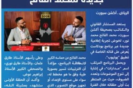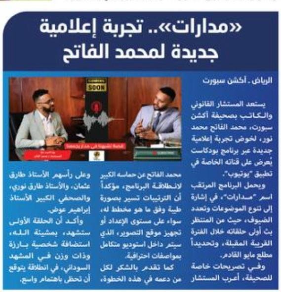 يستعد المستشار القانوني والكاتب بصحيفة آكشن سبورت، محمد الفاتح محمد نور، لخوض تجربة إعلامية جديدة عبر برنامج بودكاست يُعرض على قناته الخاصة في تطبيق “يوتيوب”.