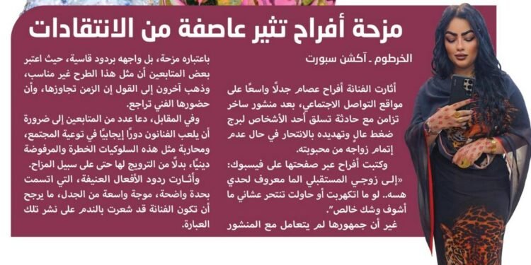 أثارت الفنانة أفراح عصام جدلًا واسعًا على مواقع التواصل الاجتماعي، بعد منشور ساخر تزامن مع حادثة تسلق أحد الأشخاص لبرج ضغط عالٍ وتهديده بالانتحار في حال عدم إتمام زواجه من محبوبته.
