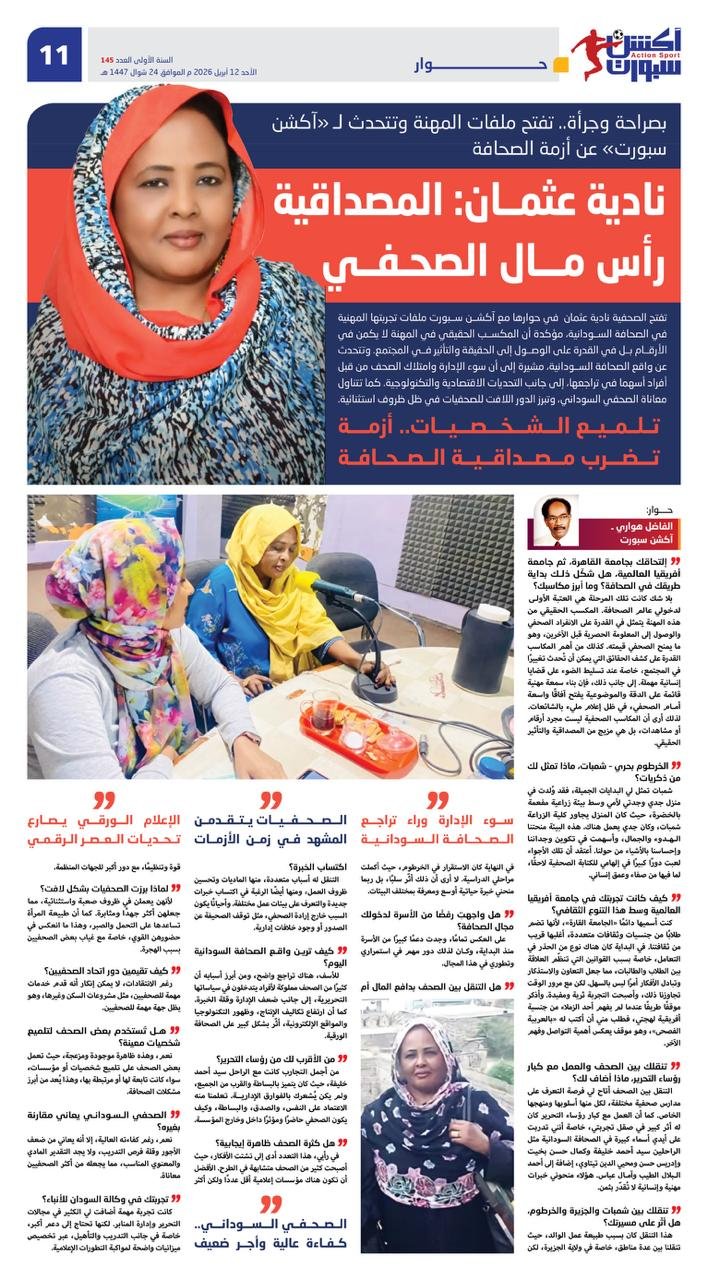 تفتح الصحفية نادية عثمان  في حوارها مع آكشن سبورت ملفات تجربتها المهنية في الصحافة السودانية، مؤكدة أن المكسب الحقيقي في المهنة لا يكمن في الأرقام بل في القدرة على الوصول إلى الحقيقة والتأثير في المجتمع. وتتحدث عن واقع الصحافة السودانية، مشيرة إلى أن سوء الإدارة وامتلاك الصحف من قبل أفراد أسهما في تراجعها، إلى جانب التحديات الاقتصادية والتكنولوجية. كما تتناول معاناة الصحفي السوداني، وتبرز الدور اللافت للصحفيات في ظل ظروف استثنائية.