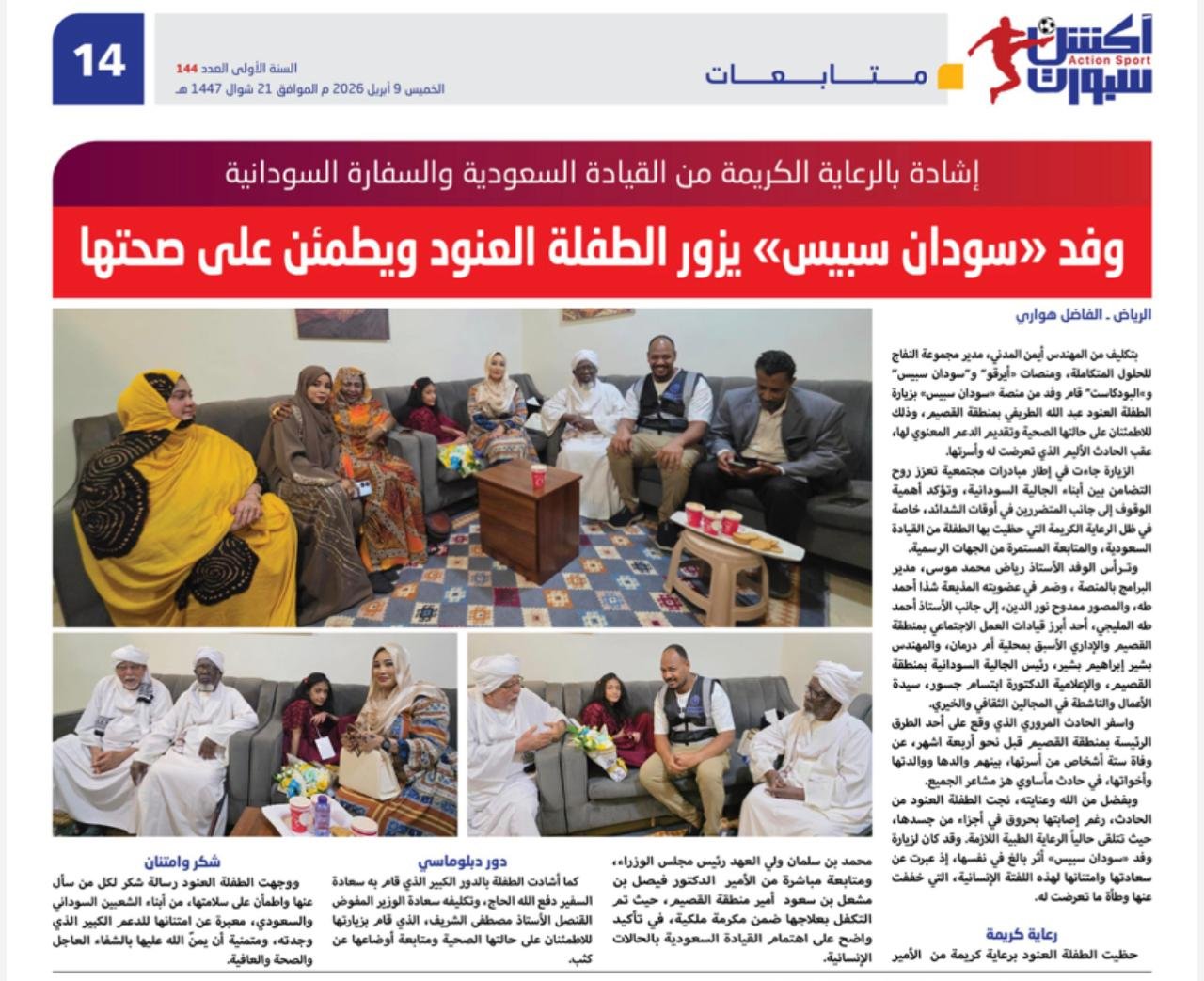 بتكليف من المهندس أيمن المدني، مدير مجموعة النفاج للحلول المتكاملة، ومنصات “أيرقو” و”سودان سبيس” و”البودكاست” قام وفد من منصة “سودان سبيس” بزيارة الطفلة العنود عبد الله الطريفي بمنطقة القصيم، وذلك للاطمئنان على حالتها الصحية وتقديم الدعم المعنوي لها، عقب الحادث الأليم الذي تعرضت له وأسرتها.