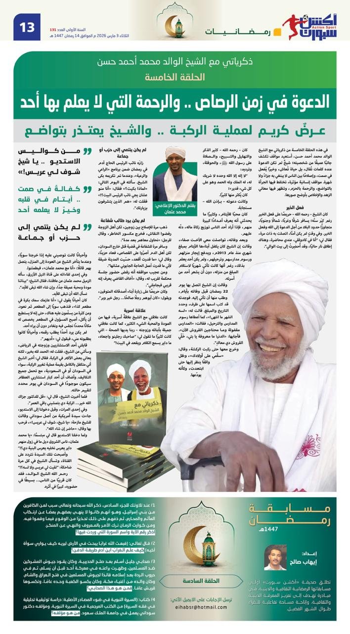 في هذه الحلقة الخامسة من ذكرياتي مع الشيخ الوالد محمد أحمد حسن، أستعيد مواقف تكشف جانبًا عميقًا من شخصيته؛ شيخٌ لم تكن الدعوة عنده كلمات تُقال، بل حياة تُعاش، وخيرًا يُفعل في صمت، وإصلاحًا بين الناس لا يبتغي به جزاءً ولا شهرة. مواقف إنسانية مؤثرة، تختلط فيها الجرأة بالتواضع، والرحمة بالحزم، وتظهر فيها معاني الزهد والإخلاص بأوضح صورها.